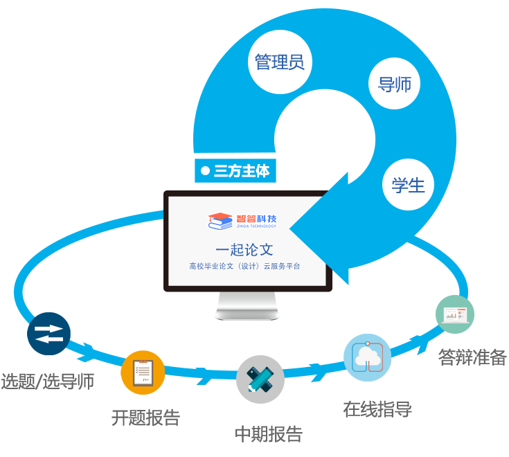 高校毕业论文(设计)云服务平台,以论文指导、批阅、查重 及答辩为主线,围绕“管理员、导师、学生”三方主体,实现 论文指导全过程实时交互、管理和跟踪。